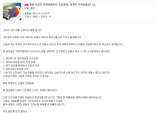 16일 오전 국내 한 온라인 커뮤니티에 "옆집 이웃인 유명 연예인의 소음문제.. 끝까지 가야되겠죠?" 라는 제목의 글이 올라왔다.